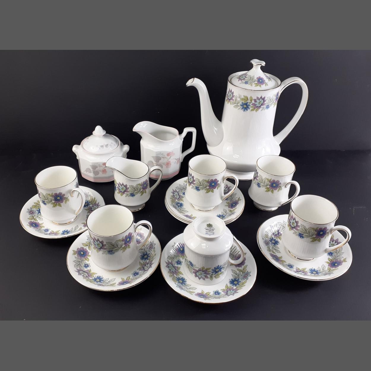 A PARAGON Cherwell coffee set comprising 6 coffee cans, 6 saucers, 1milk jug and 1 large coffee pot plus a Francine milk jug and sugar bowl with lid