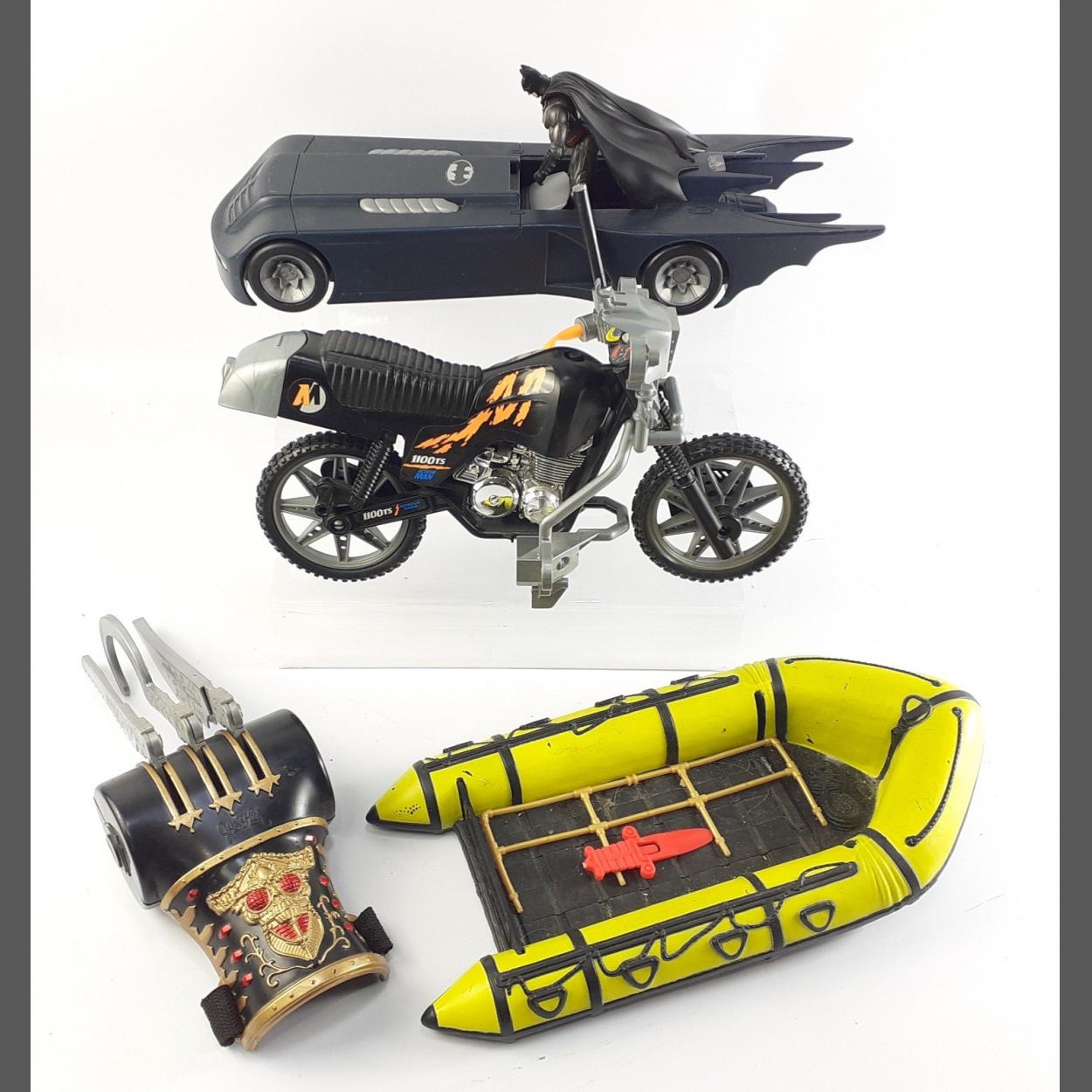 A mixed collection of toys to include DC Comics BATMOBILE, Captain Hook's hook and an ACTION MAN motor cycle and a boat