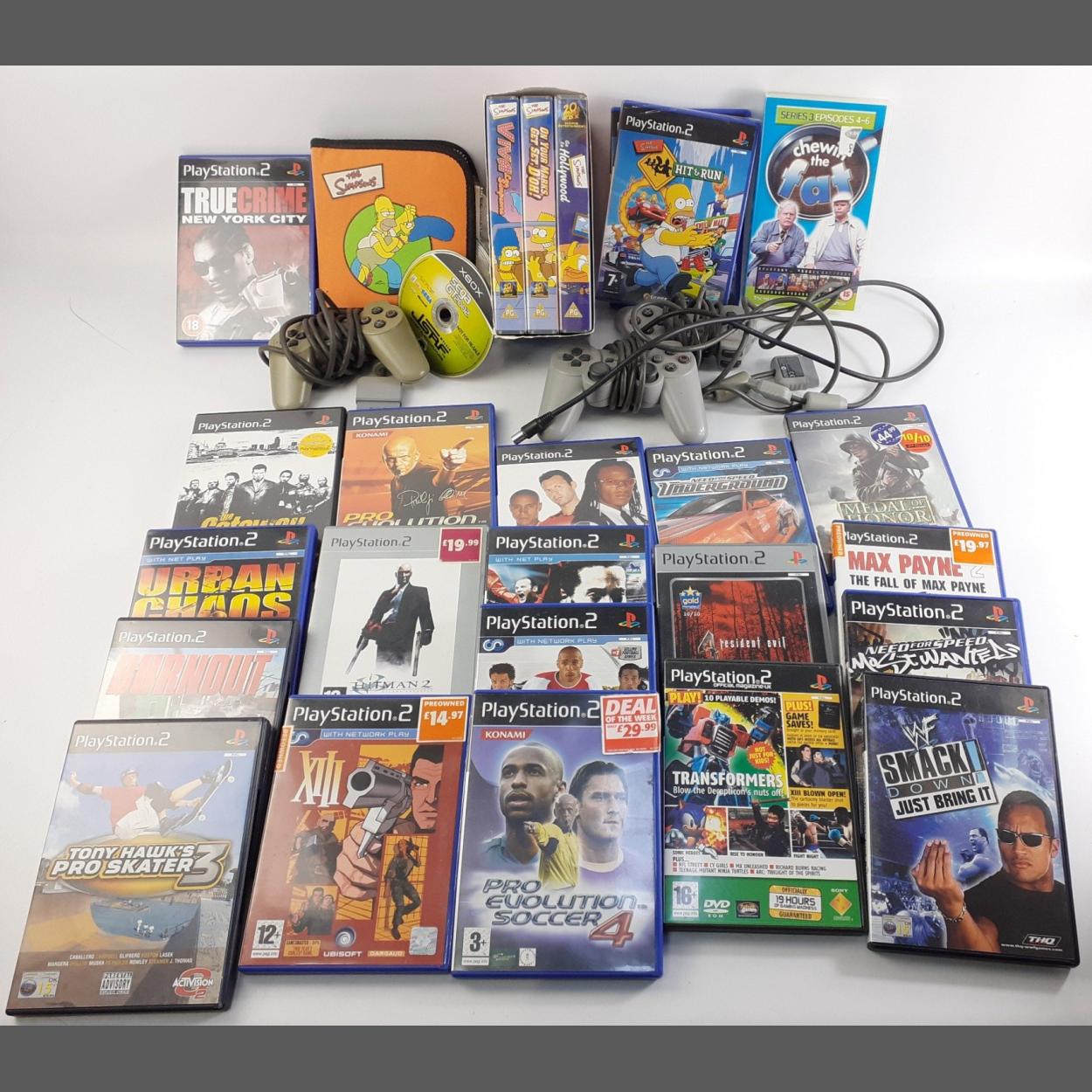 A selection of Playstation 2 games to include Pro Evolution Soccer, FIFA, Hitman 2, True Crime NYC, various WWF games, Tony Hawks Pro-Scare Burn-Out, Simpsons, Medal of Honor, Simpsons VHS box set, some controllers,
