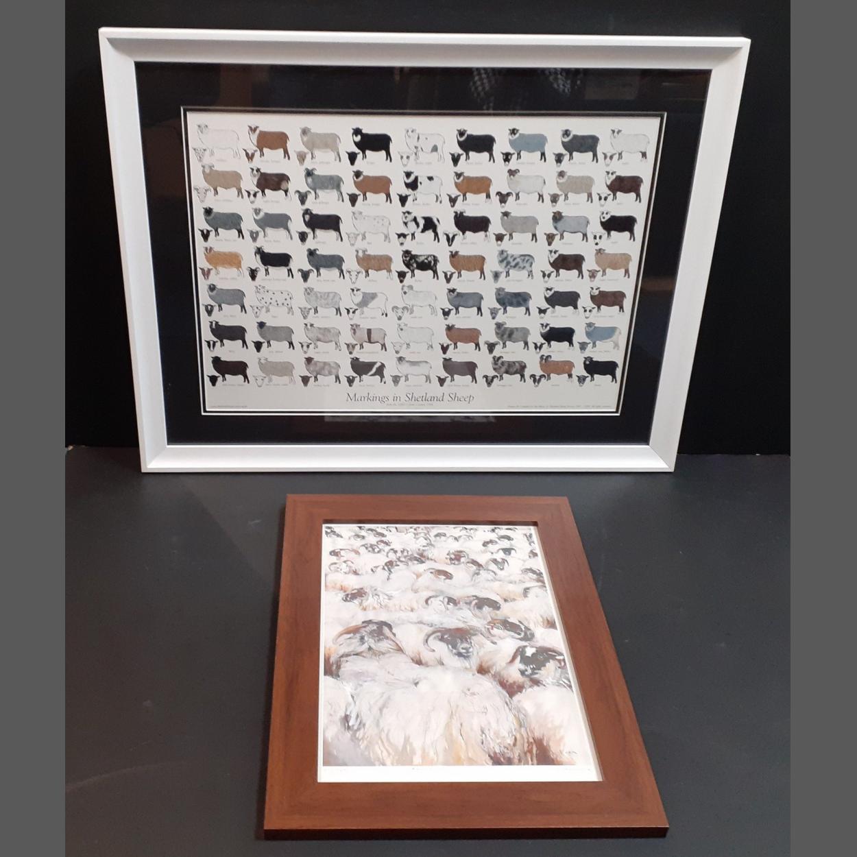 A print of MARKINGS IN SHETLAND SHEEP from the SSBG Colour Census frame size 78 x 60cm approx and also ROUND UP mixed media by C VEGA 49 x 39cm approx
