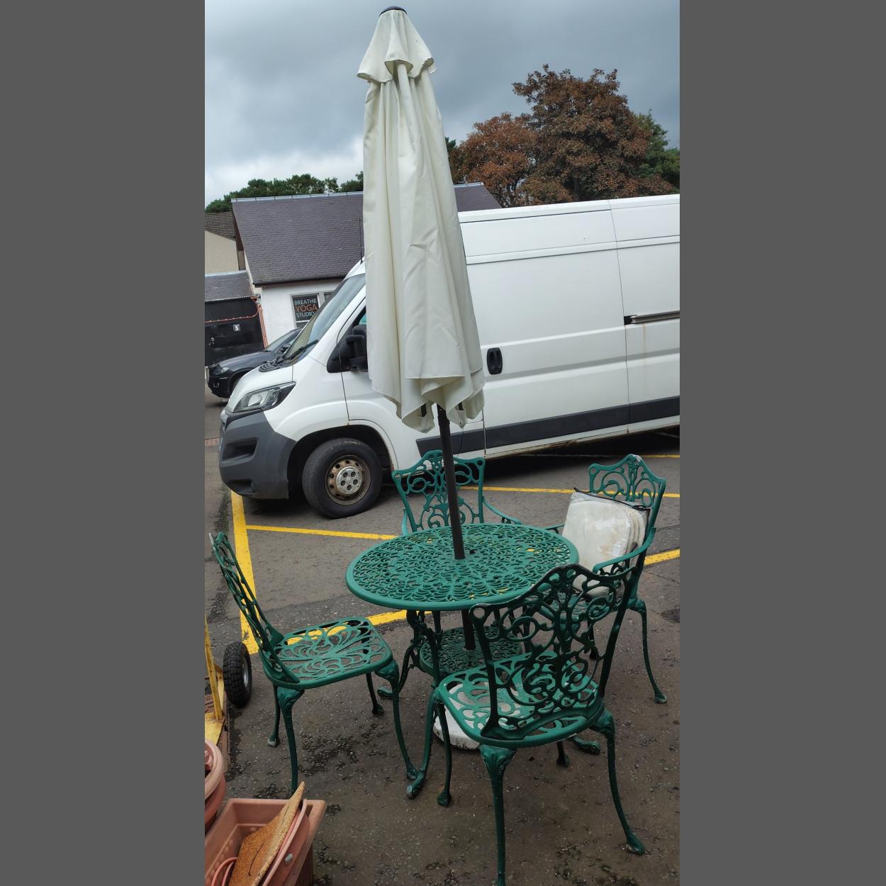 Garden table and four chairs with wind up parasol. In green finish, minor wear from use but good useable condition. Parasol appears quite new.