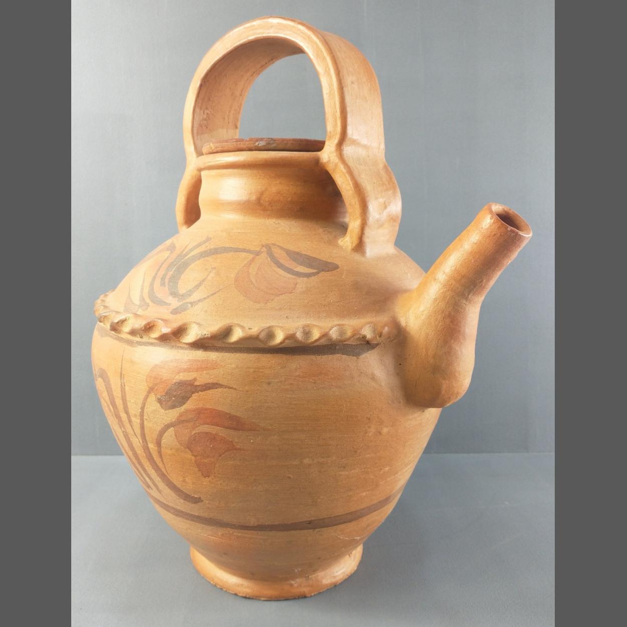A large terracotta lidded water pot with hand-painted design. Stands 38cm high approx. Minor nibble noted to the lid.
