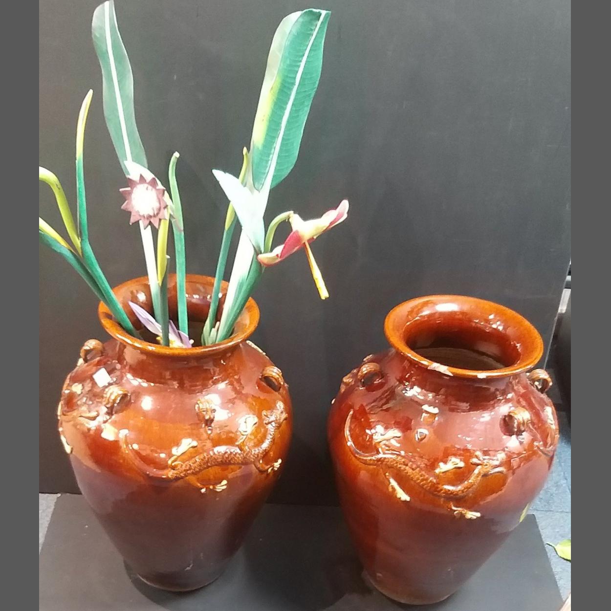 A pair of substantial highly-glazed dragon decorated pots, each 60cm tall approx, historical chip to one and broken handle. Both in same area so can be kept hidden from view.
