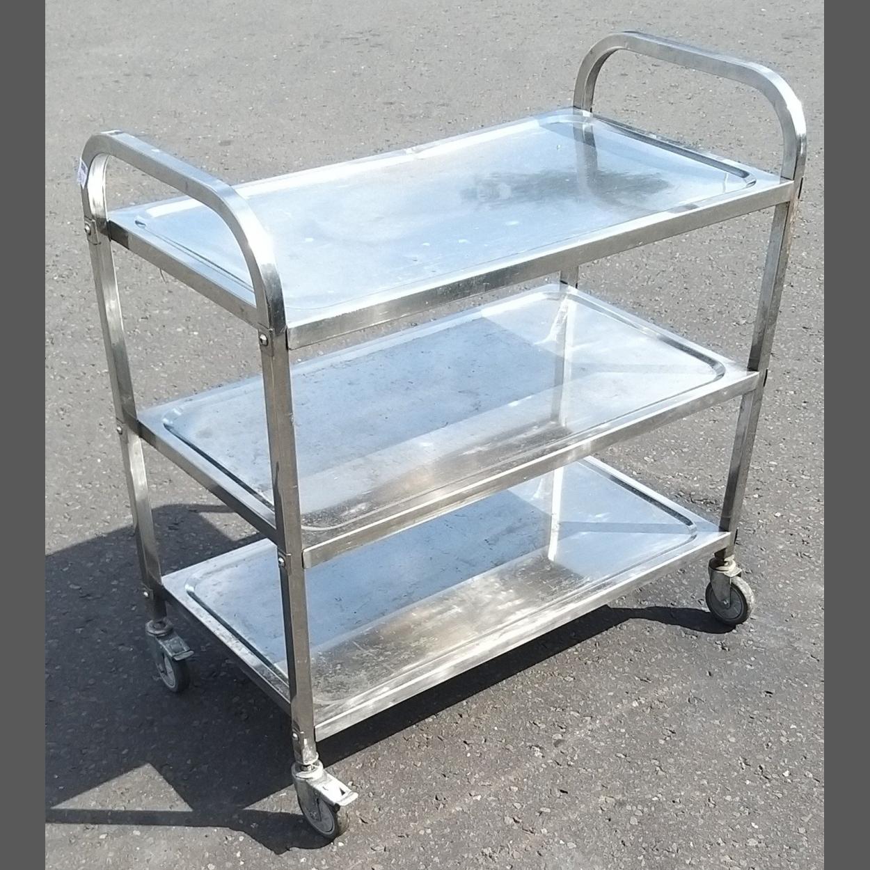 Three tray catering wheeled trolley in good used condition with a dent in top. Stands 94cm aprox.