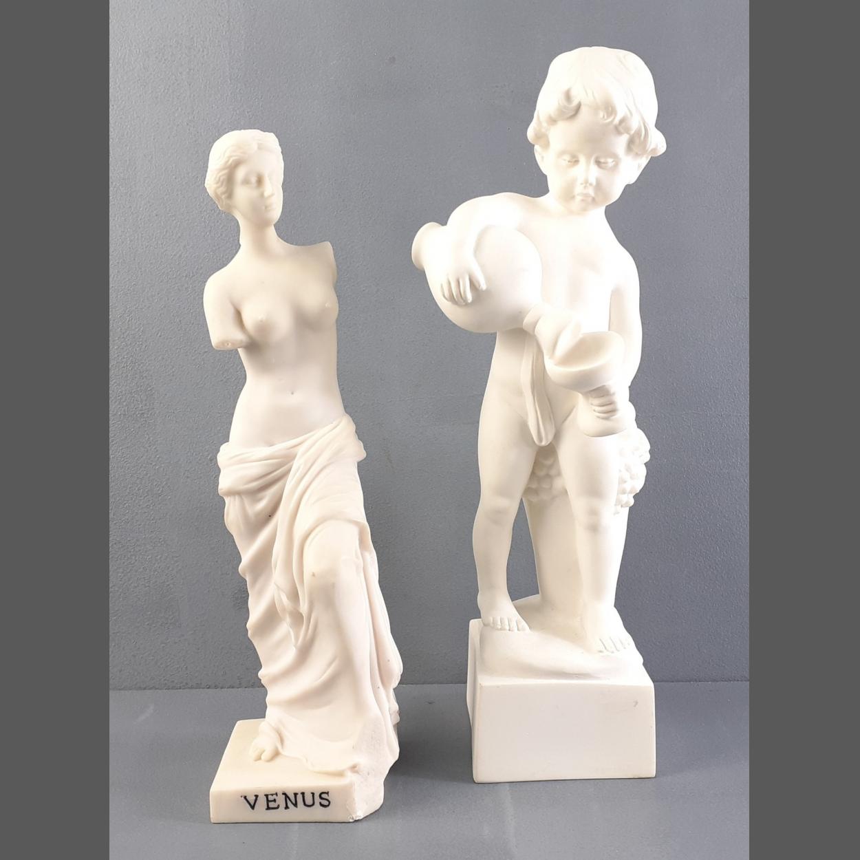 Two white stone figures. Venus and Cherub. The Cherub stands 26cm tall approx.