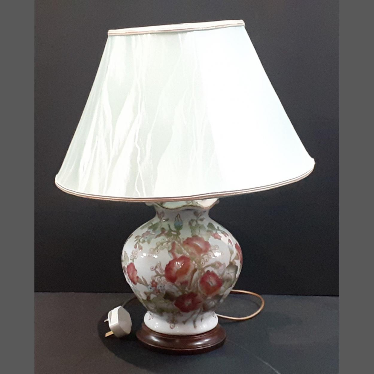 An Oriental floral decorated ginger jar style lamp with shade. Stands approx 44cm exc. shade.