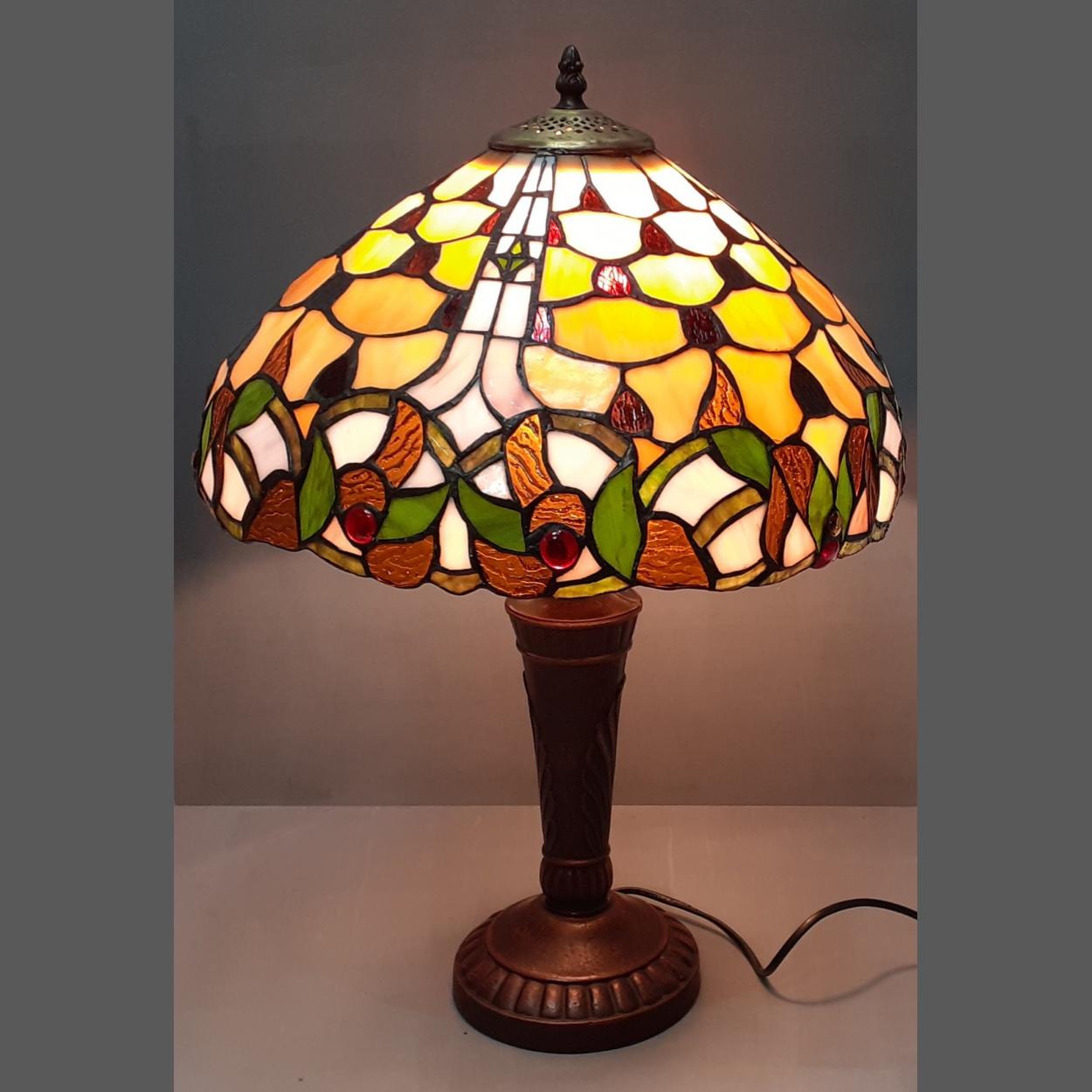 TIFFANY style table lamp with nice bronzed effect base and colorful shade with cabochon glass beads. Standing 60cm tall approx and in lovely condition.