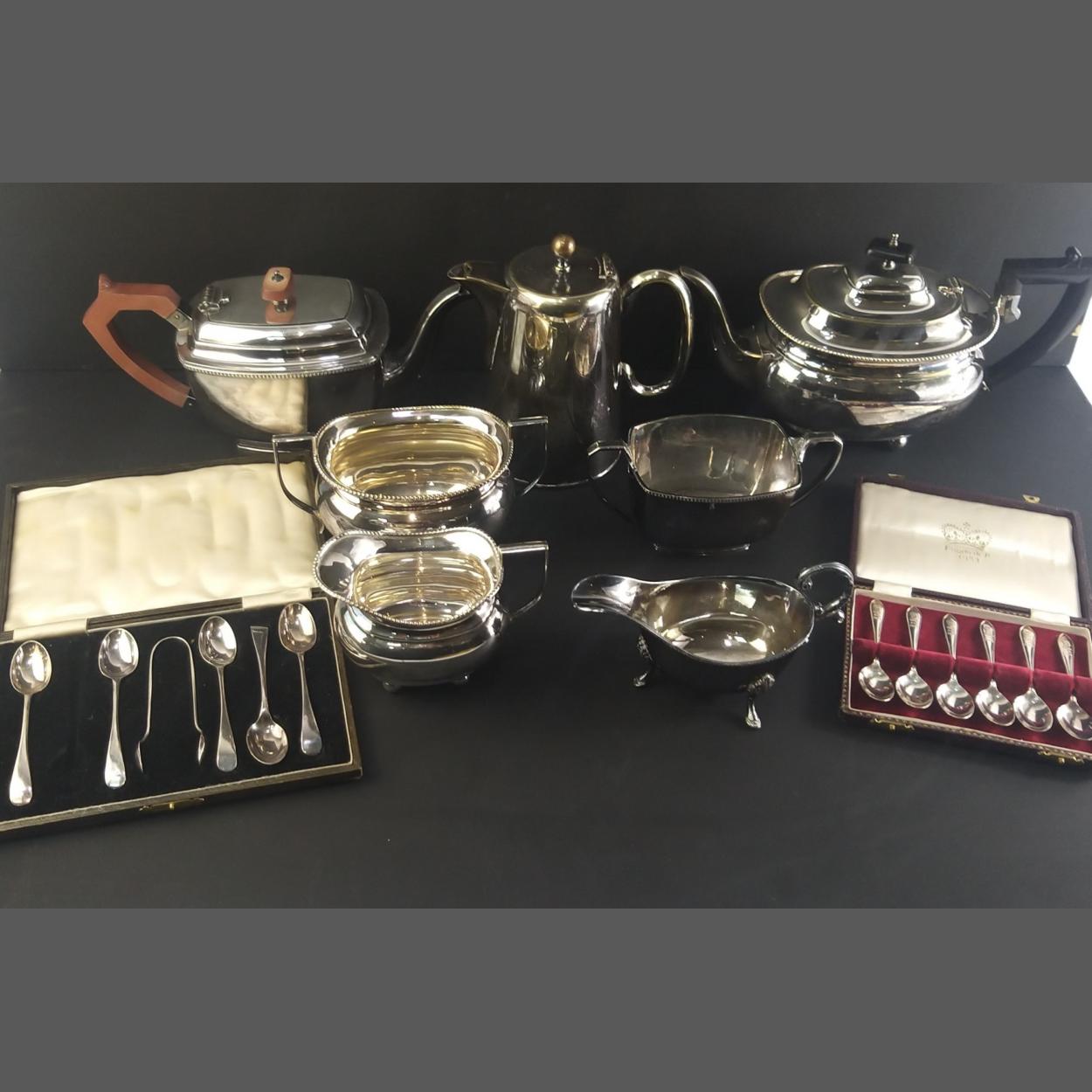 A silver plate lot to include tea pots, sugar bowls, milk jugs, one boxed set of six E.R 1953 teaspoons and a boxed part set of 5 tea spoons.