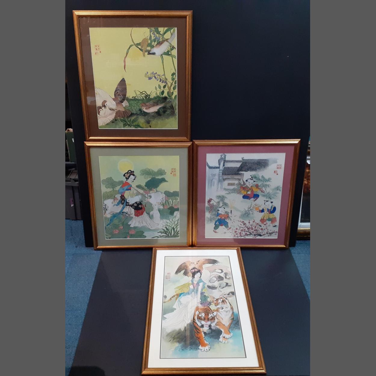 Four wonderful Oriental mix media pictures of Chinese scenes in frames. Very appealing scenes. The largest 778cm x 50cm approx.