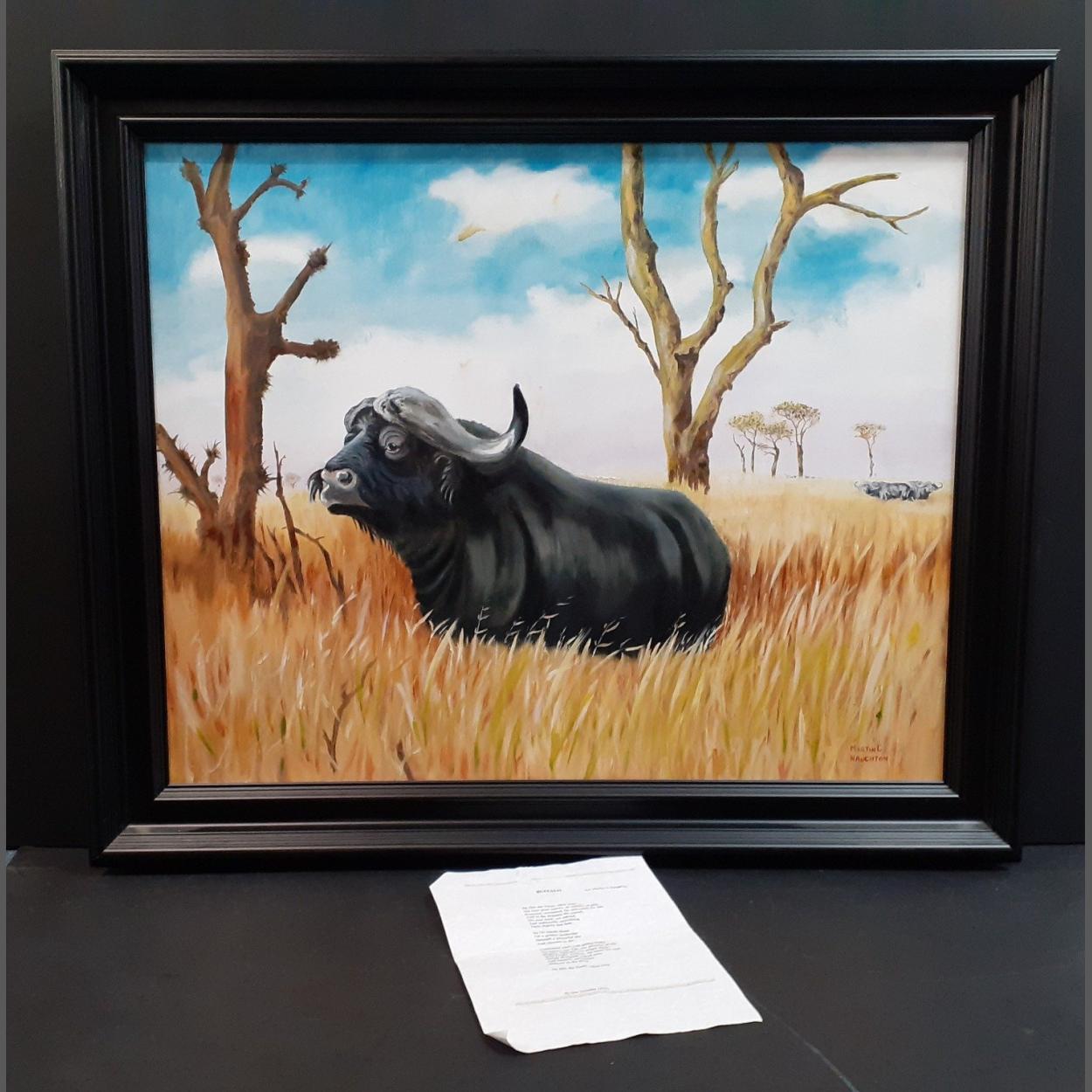 Martin C Naughton - Wildlife artist. A wonderful large acrylic BUFFALO 91cm x 76cm approx. Artwork by this artist is in the Royal Collection Trust.