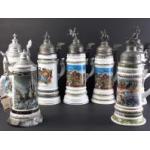 THEO RUHN Bavaria Germany Burgmindheim Beer Steins x 7. A wonderful collection of Steins with figural lids and transparent scenes in the bases. Lavishly decorated with mostly military scenes. All in wonderful condition.