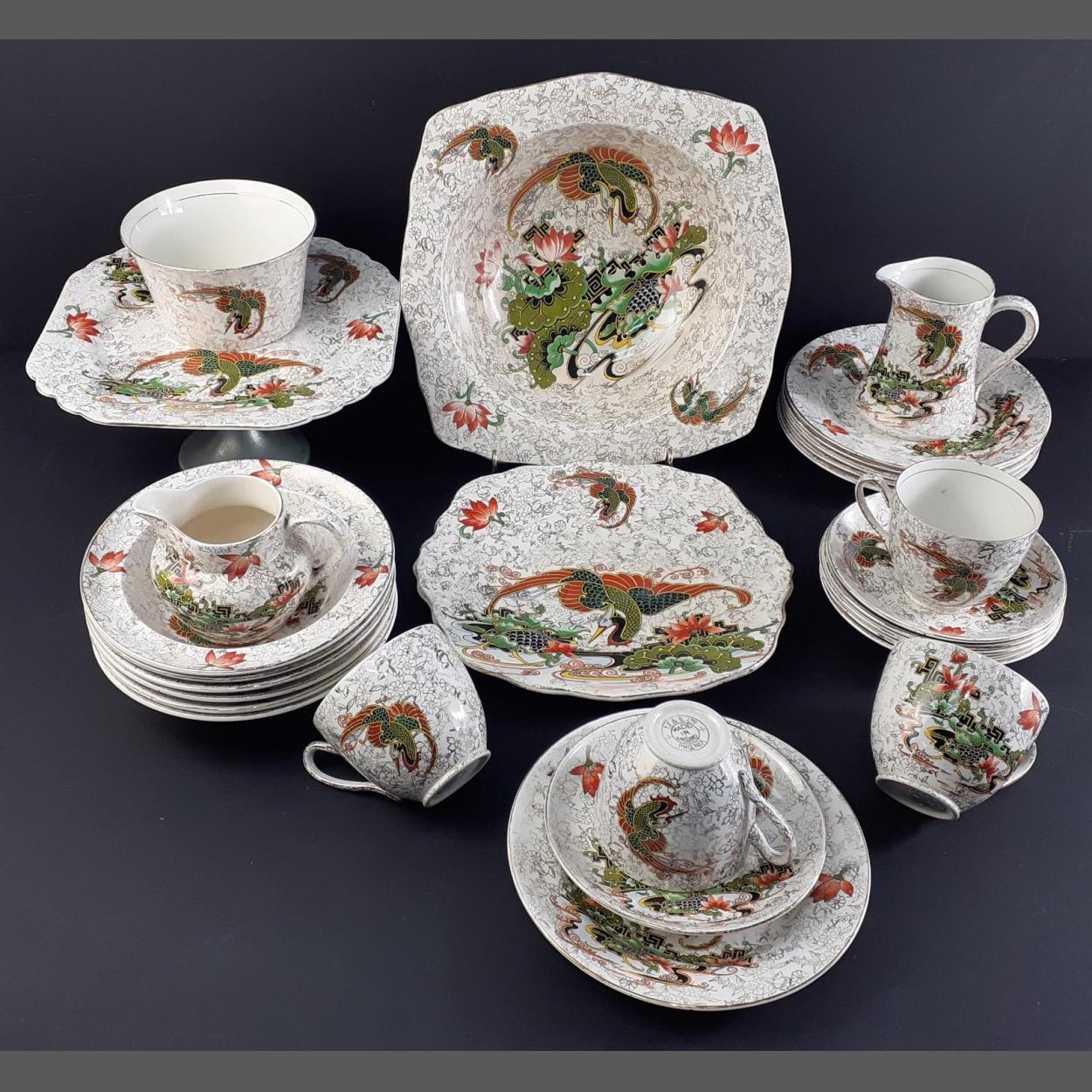 PHOENIX WARE part tea service with Oriental Phonis and Lotus pattern. Comprising cake stand, serving bowl, sandwich plates, six pudding bowls, six side plates, four cups and six saucers, milk, sugar and cream bowls. All pieces with minor wear but good overall condition.