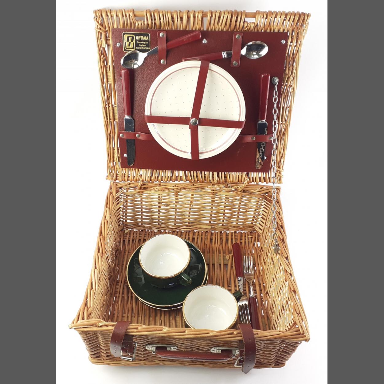 A nice OPTIMA wicker picnic hamper with contents. dimensions 40 x 35cm approx