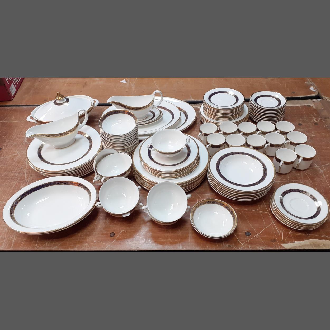 Superb large dinner service ROYAL DOULTON Harlow H.5034 stamped 1973. Gold rimmed service in lovely condition, comprising tureen, large serving plates, dinner plates, side plates, soup bowls, gravy boats, cups and saucers.