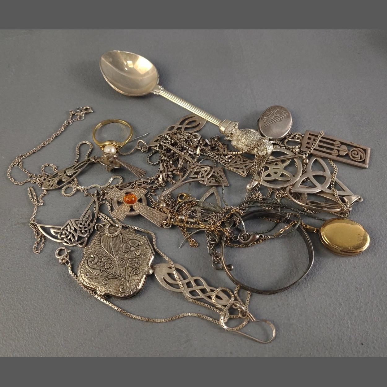 A wonderful sterling silver jewellery lot to include RENNIE MACKINTOSH pendants and earrings, Celtic cross pendant on silver chain, and others. Gross weight 60+g approx. Plus a plated wise owl spoon.