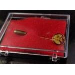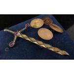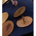 A pair of 375 stamped VINTAGE cufflinks - weight 4.93g approx with a decorative white metal kilt pin with purple stones and a small lapelle badge