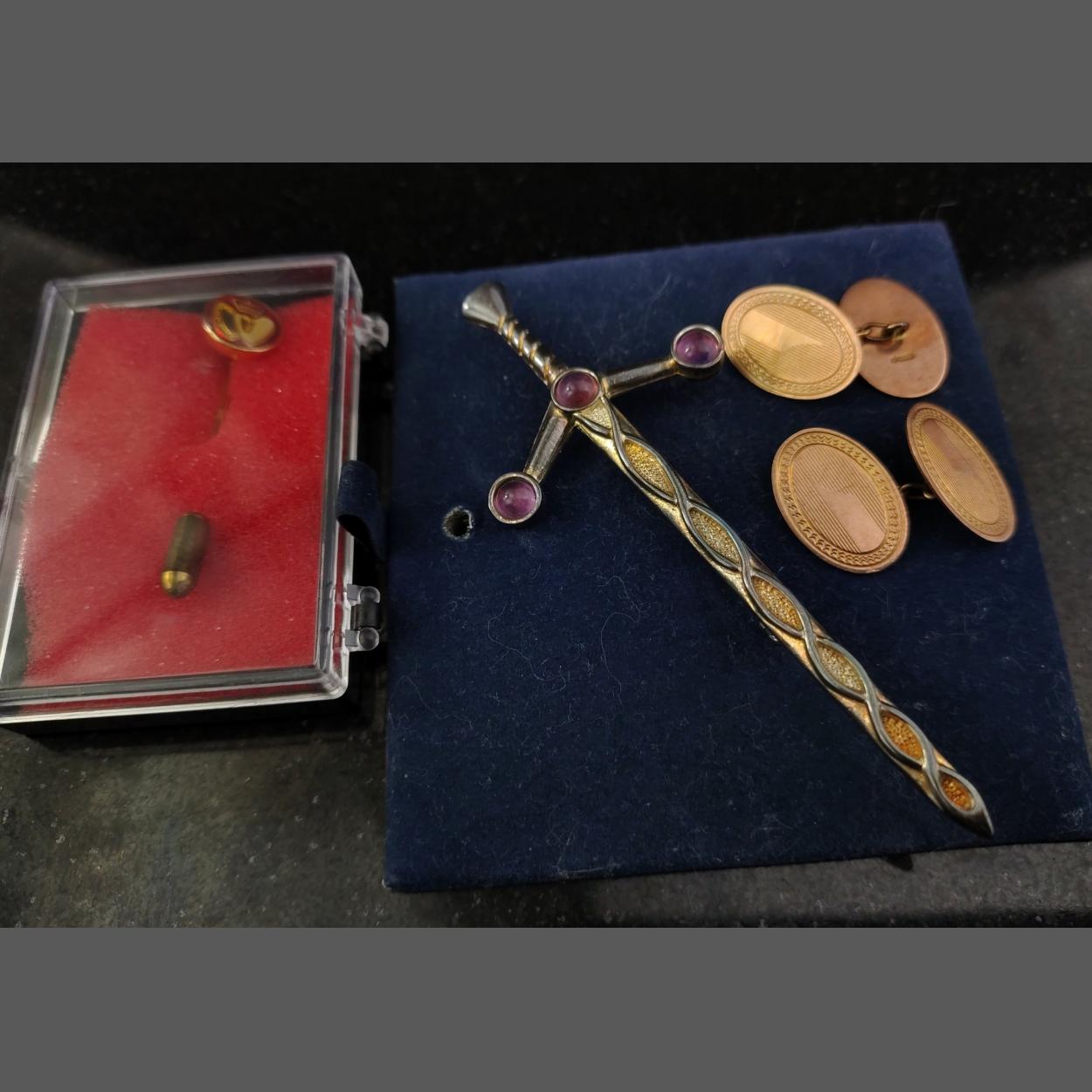 A pair of 375 stamped VINTAGE cufflinks - weight 4.93g approx with a decorative white metal kilt pin with purple stones and a small lapelle badge