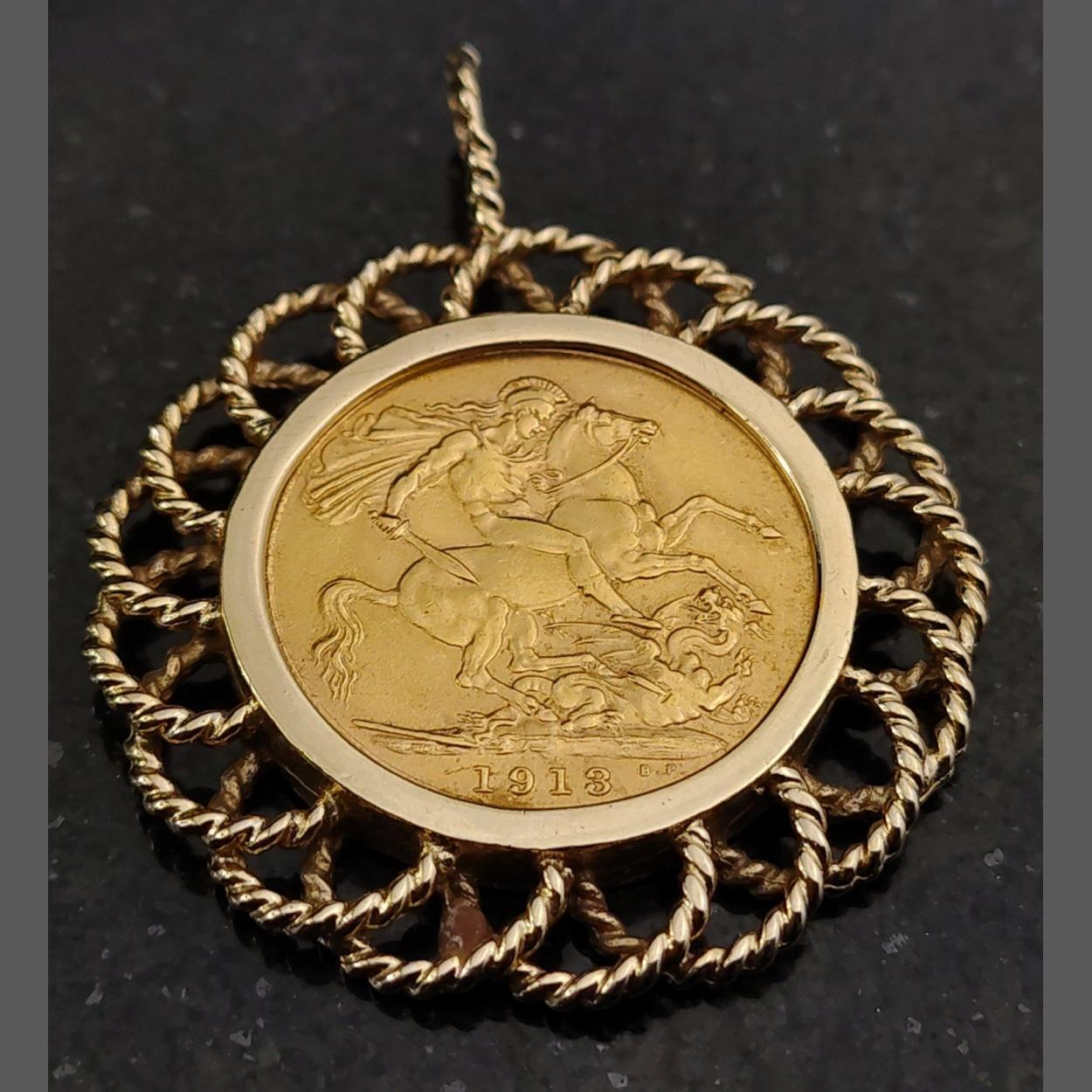A 1913 gold FULL SOVEREIGN mounted in a stamped 375 ornate gold mount - total weight of soverign and mount combined 13.32g approx