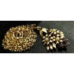 A pretty 375 stamped pendant in floral form adorned with seed PEARLS and small GARNETS and comes on a 375 stamped yellow chain - total gross weight 4.69g approx