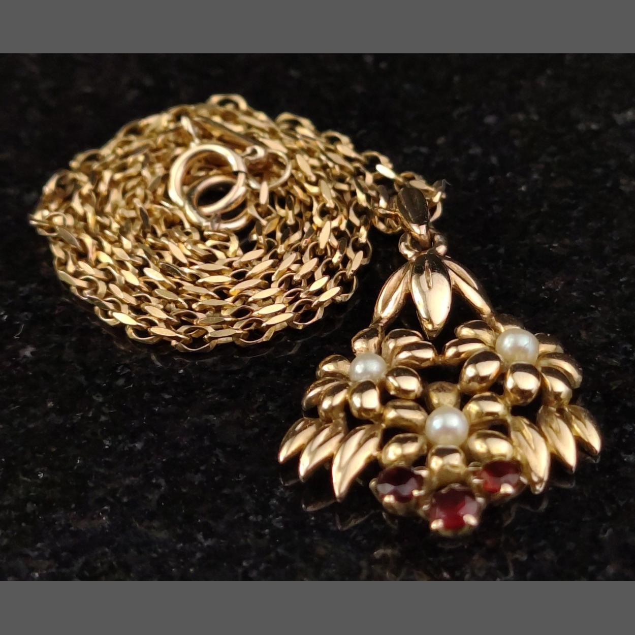 A pretty 375 stamped pendant in floral form adorned with seed PEARLS and small GARNETS and comes on a 375 stamped yellow chain - total gross weight 4.69g approx