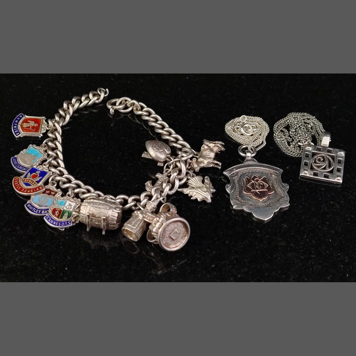 A collection of SILVER stamped pieces to include a charm bracelet with multiple charms, a Mackintosh inspired pendant with chain, a commemorative medal 1956 Glassford Gala day with possibly 'yellow metal' central raised design motif - gross weight 60.52g approx