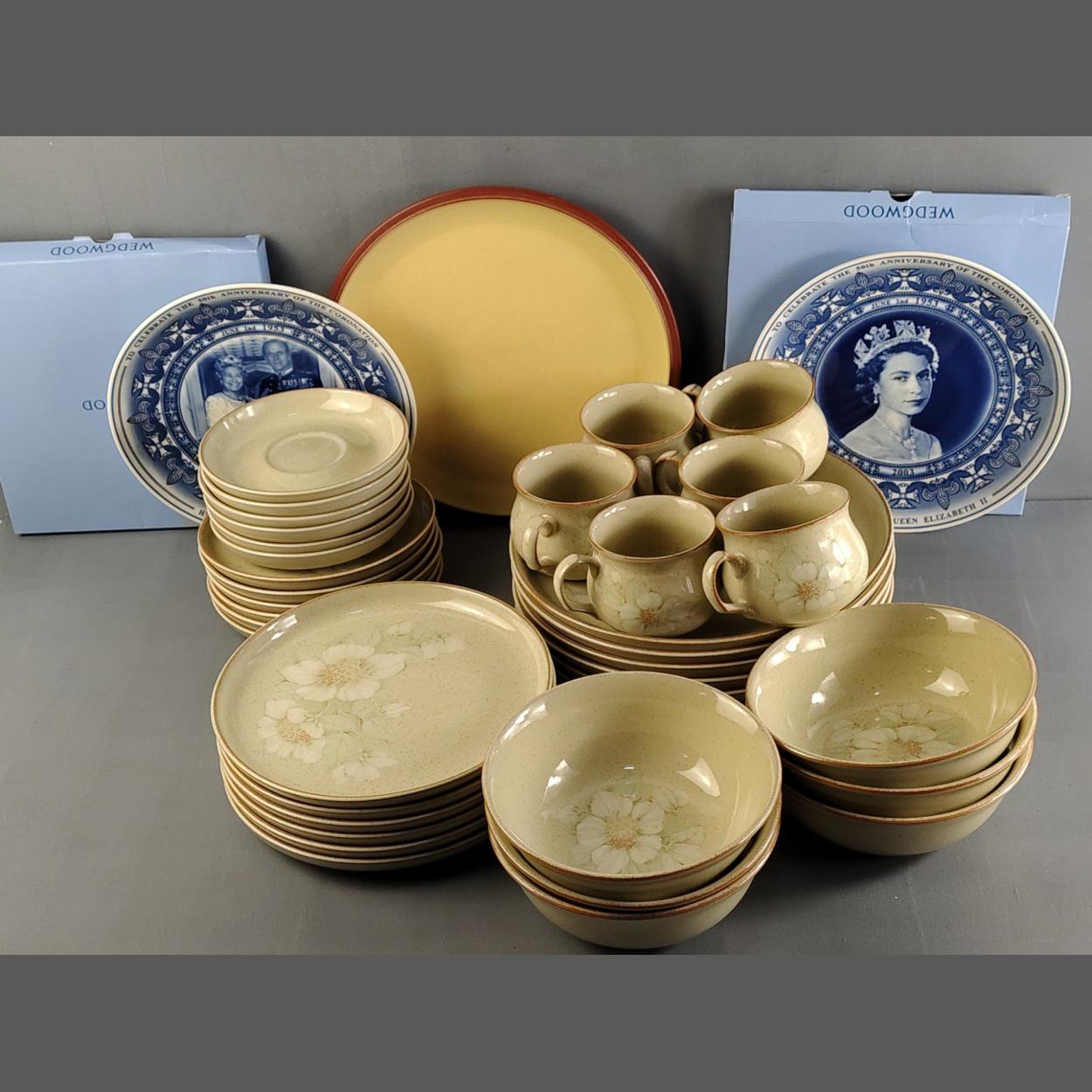 DENBY DAYBREAK tea service consisting of large plates, side plates and bowls. Six cups and saucers. All in lovely useable condition. Comes with two WEDGWOOD commemorative plates in boxes.