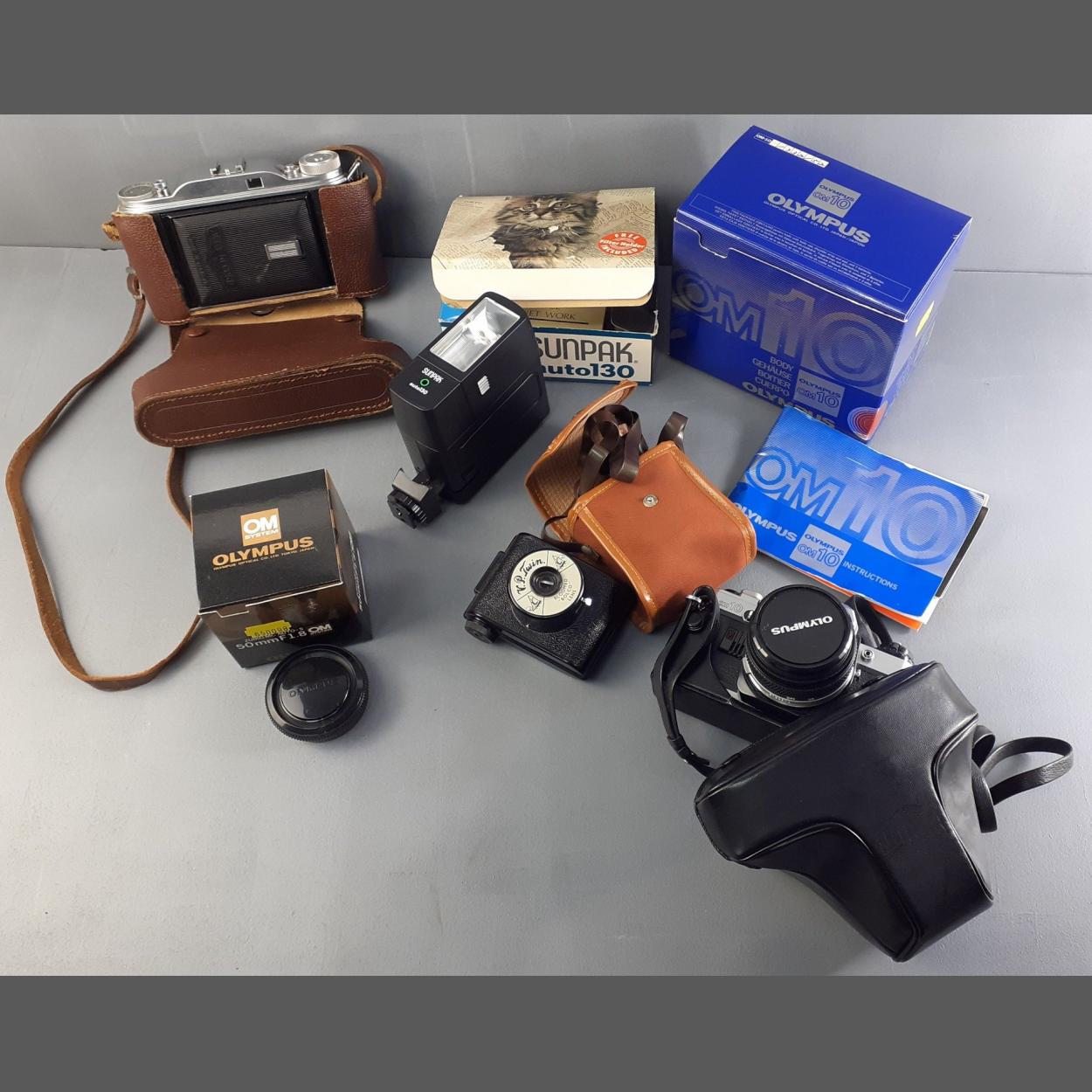 An OLYMPUS OM10 with 1:1/8 f=-50mm lens in case. With other vintage pieces.