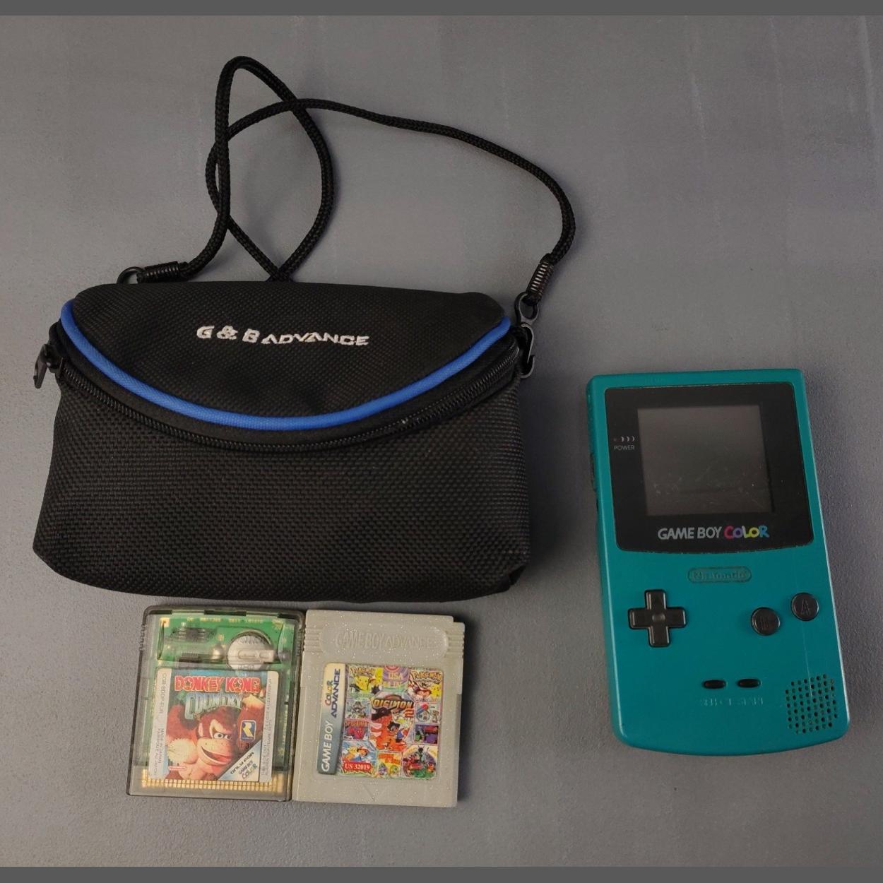 GAMEBOY COLOUR in soft carry case also with Donkey Kong cartridge and compilation game (titles include Digimon, Pokémon Jade, Spiderman). Untested