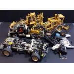 Four LEGO TECHNIC models - combine harvester, truck, JCB digger, and a race car. All missing some pieces.