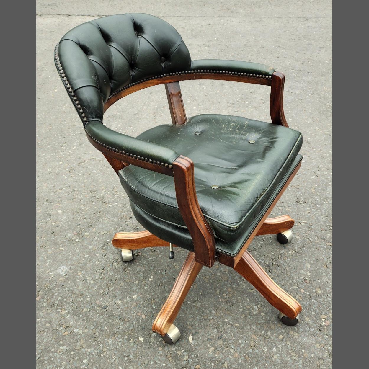 A lovely drab green captain's chair with light wear. A stylish, attractive and useable piece of quality furniture.