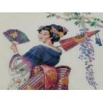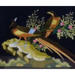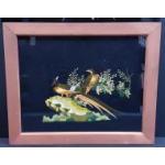 Three Oriental artwork pieces. One inlaid Vietnamese mother of pearl birds, one woolwork scene of Geishas and one woolwork pheasants. The largest 60 x50cm approx.