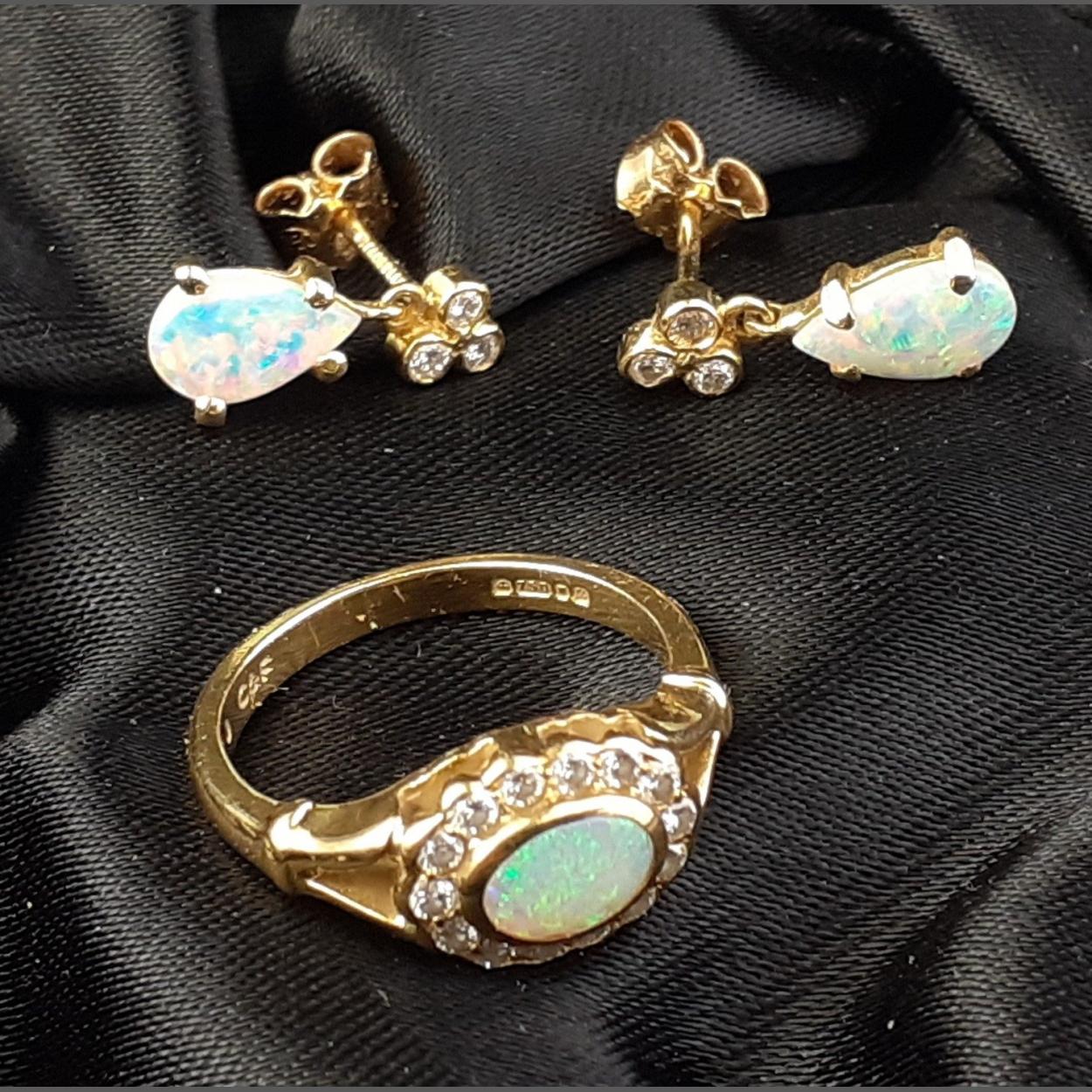 Superb OPAL and diamond suite comprising 18ct fully hallmarked ring with opal surrounded by 14 diamonds, with matching 750 stamped earrings. Ring size I, Gross weight 5g approx