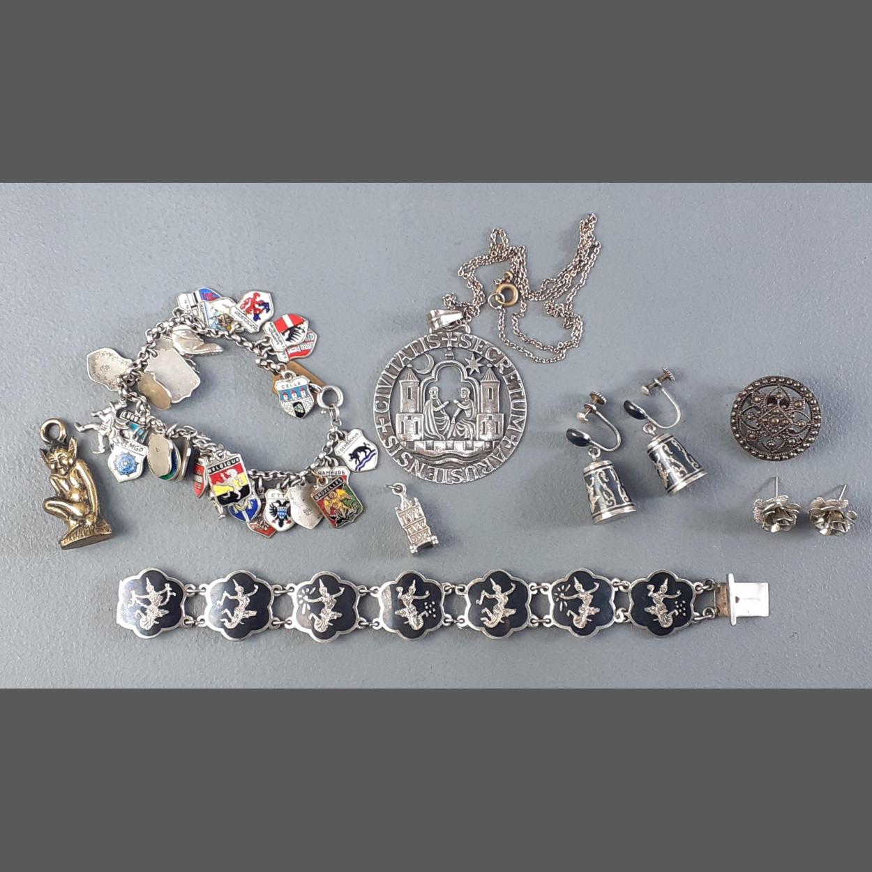 A sterling silver Siamese bracelet and earrings, a chain with German town charms with various 800/835 marked city charms. An 830 stamped pendant and others. Total gross weight 70g approx.
