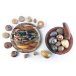 Two super decorative trays, one with a quantity of polished stone eggs and one with a number of small pots.