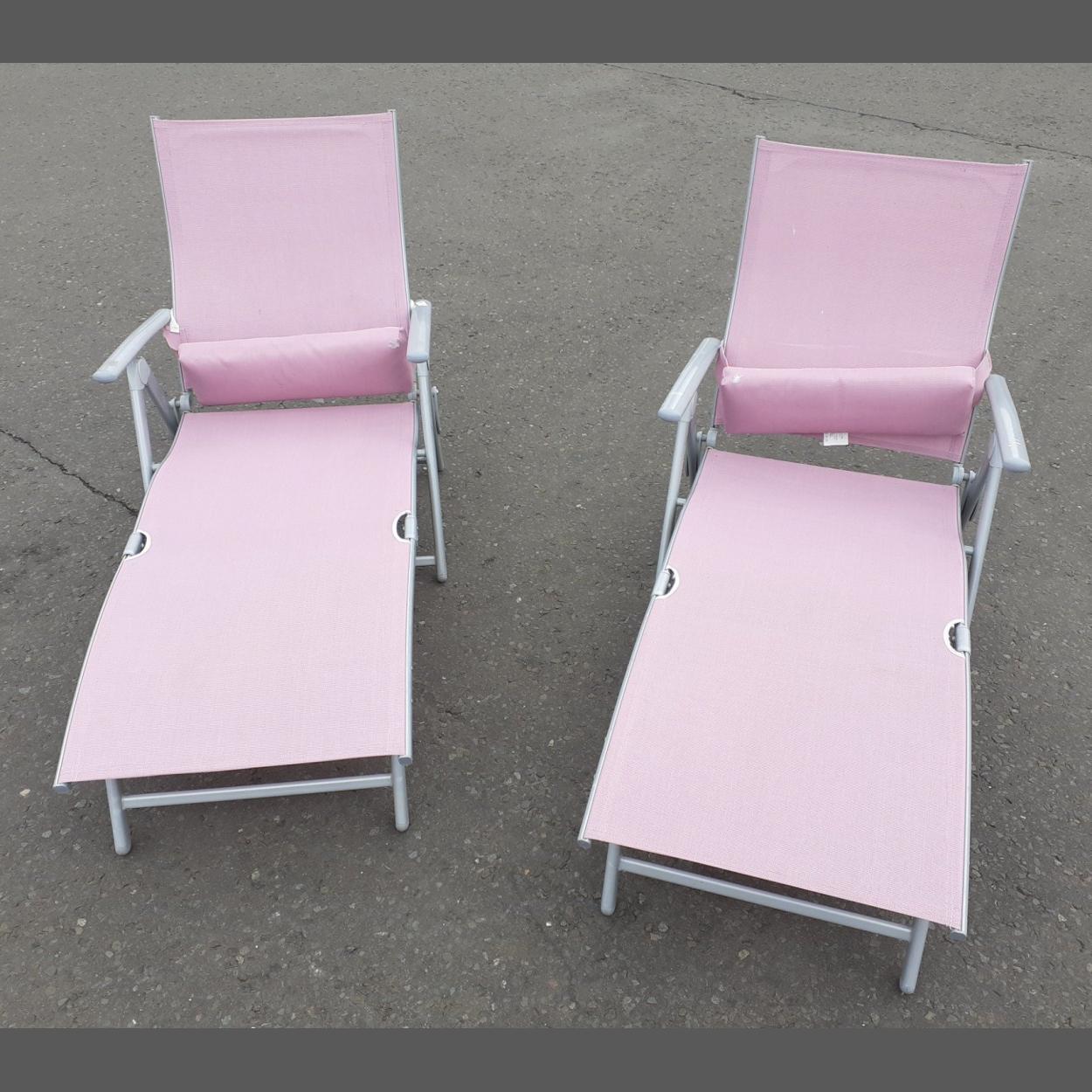 Two pink folding garden lounger chairs.