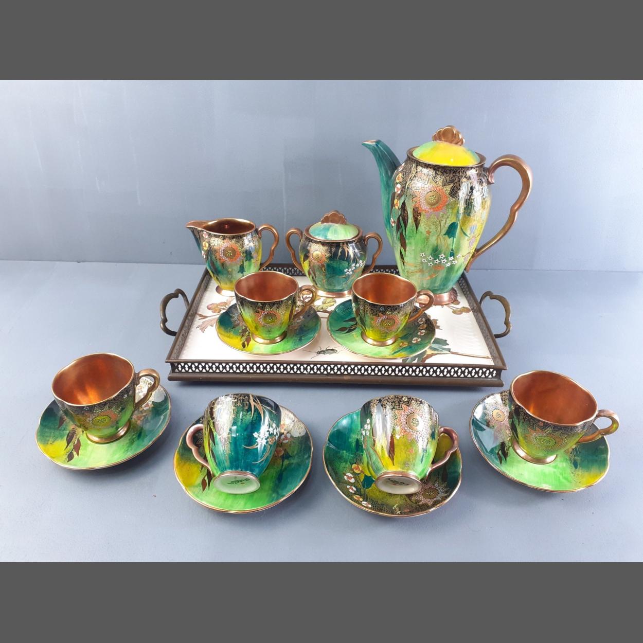 CARLTON WARE 1582 BABYLON coffee service comprising coffee pot, six cups and saucers, sugar and cream. Intricate floral pattern, gilt interior and in very clean useable condition. Comes with a similar age tray although in a different pattern.