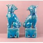A pair of attractive turquoise plaster FOO DOGS standing approx 16cm high. Tiny chip from base of one.