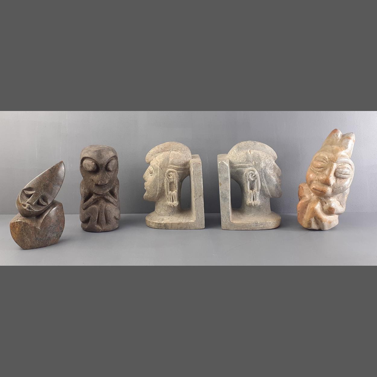 A collection of decorative items to include African stone head bookends (18cm approx) and other African stone decorative heads. Minor chips noted.