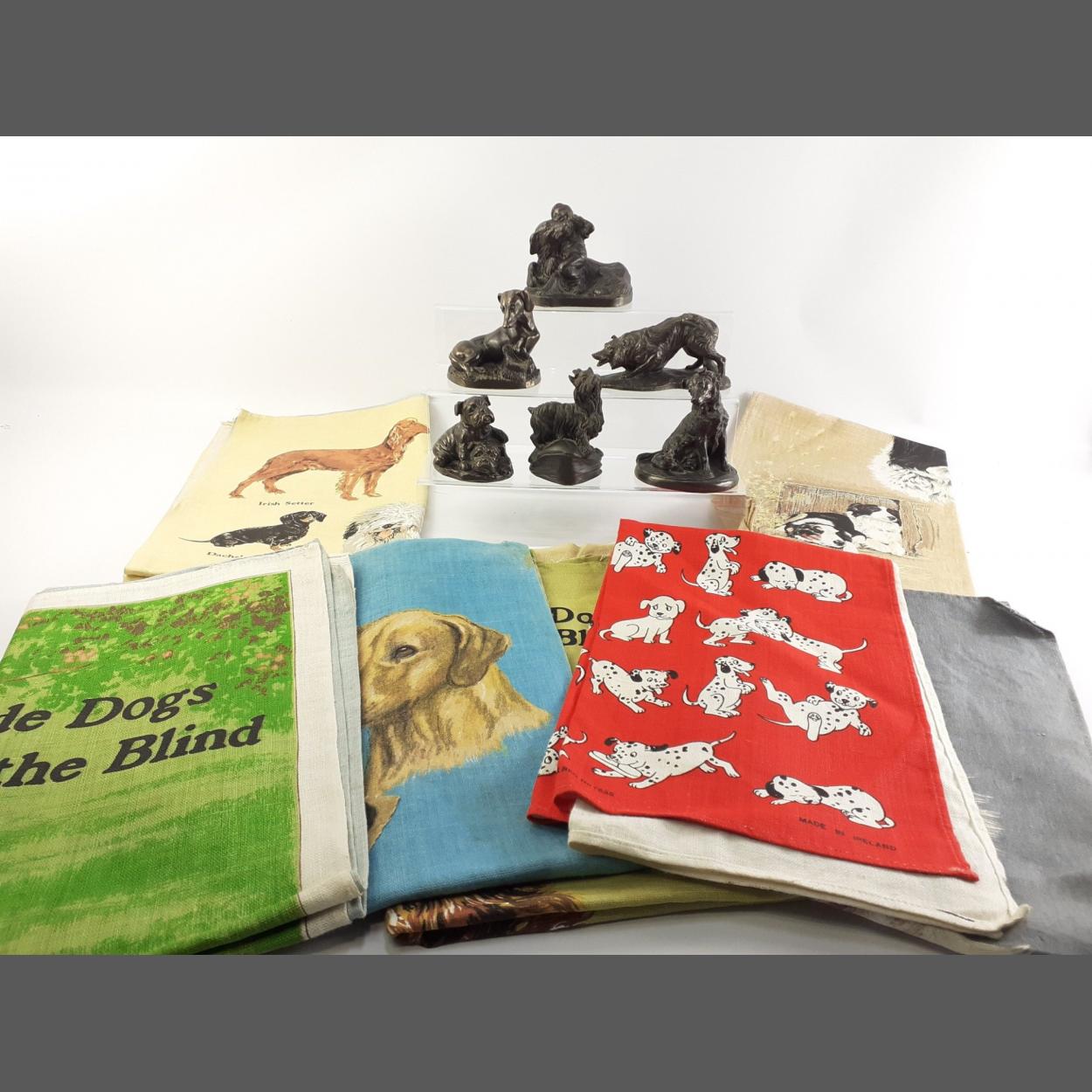 A collection of 6 bronze effect dog figurines including a collie, bulldogs, wolfhound, terrier etc. Tallest 12cm approx. Comes with 7 linen tea towels featuring dogs.
