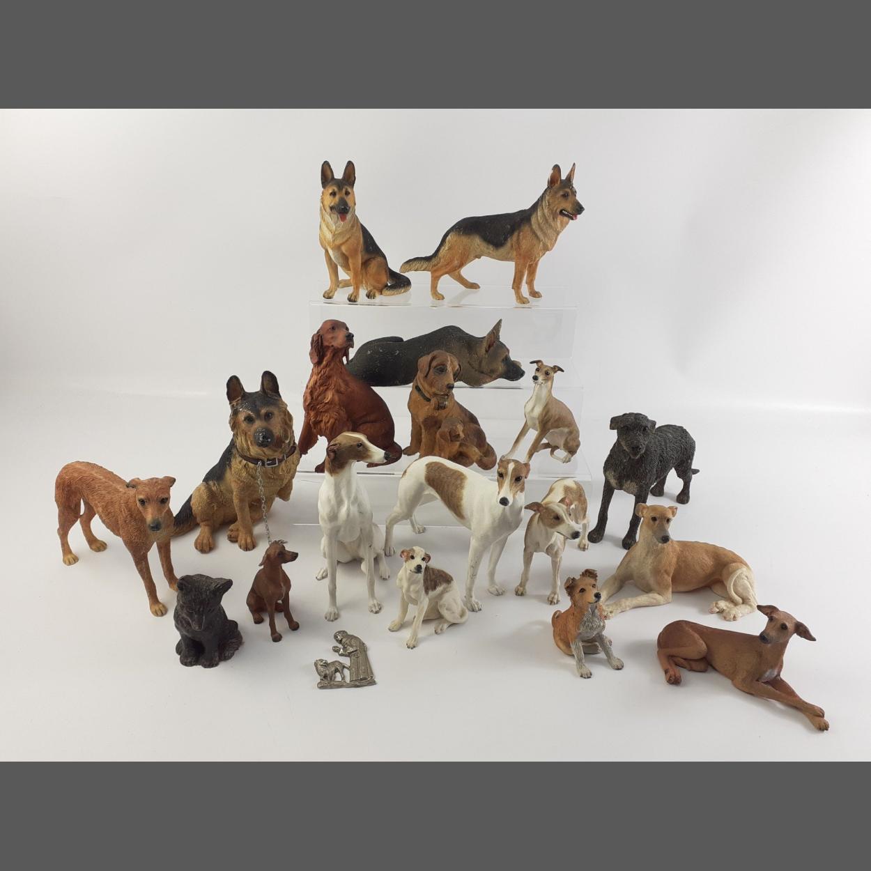 A pack of dogs including some German shepherds, whippets and others