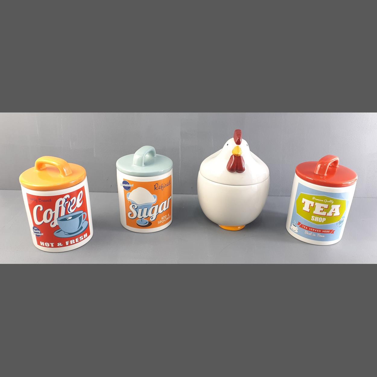 A nice decorative kitchenware lot comprising colourful coffee, tea and sugar storage jars and a ceramic chicken egg holder.