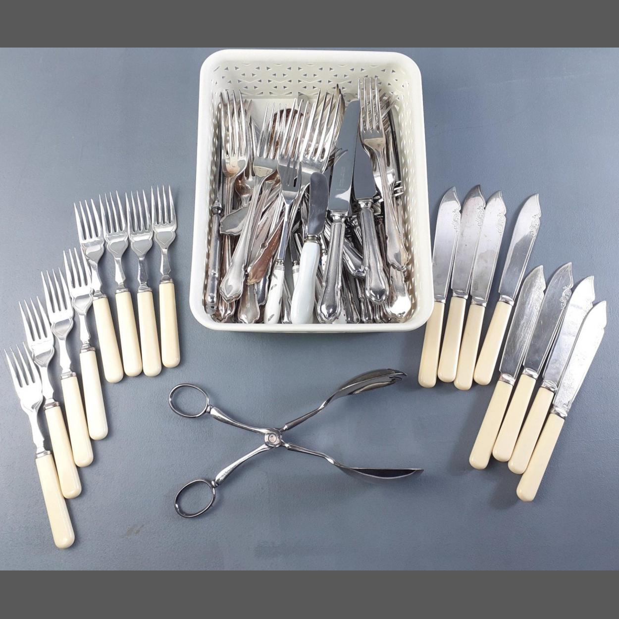 A box of mixed cutlery including by COOPER BROS, and a set of fish knives and forks.
