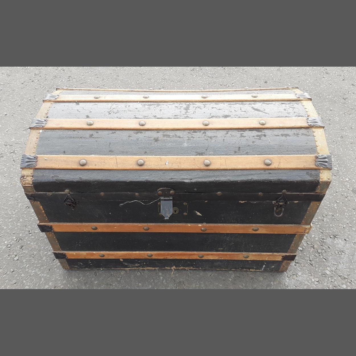 A dome -topped banded travel trunk measuring W85 x D52 x H56cm approx