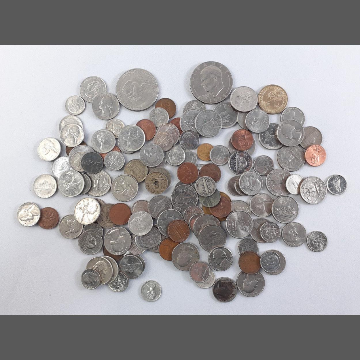 A collection of North American coins of interest to include States Quarters, two IKE Dollars, Canadian quarters etc. Some silver content.