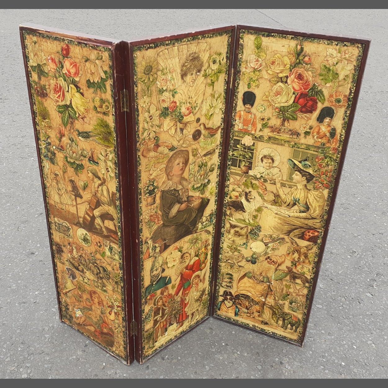 A wonderful antique room three panel room divider / screen covered in scraps.