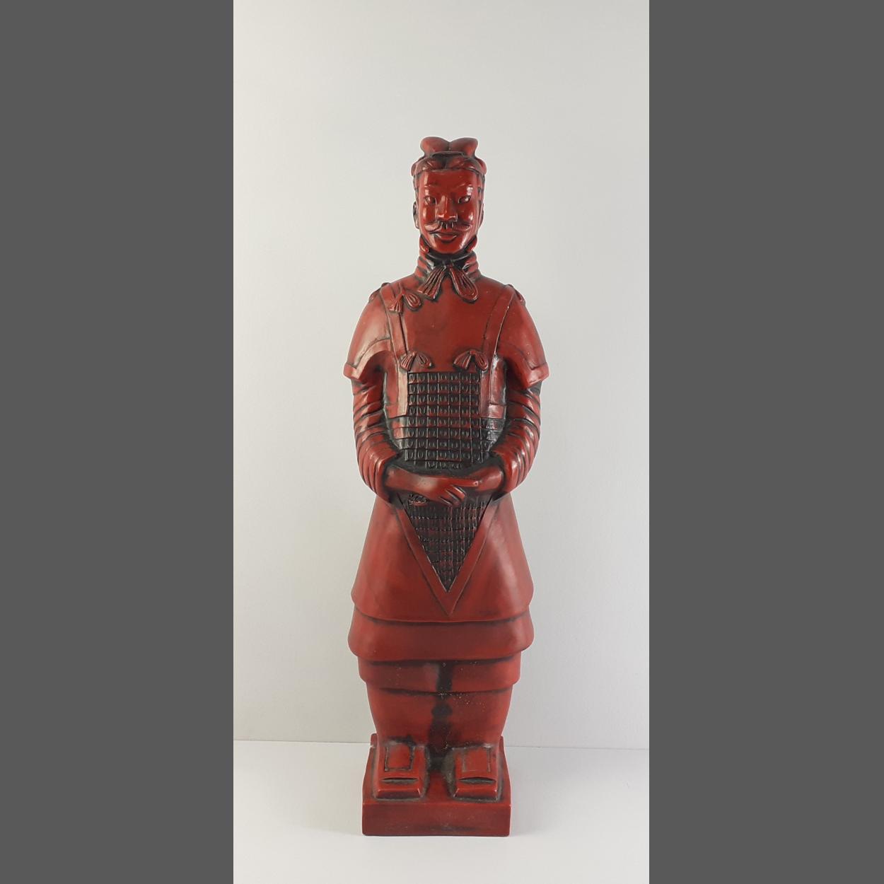 An imposing red resin figure of a Chinese figure. Reminiscent of the Imperial Terracotta Army style figures. 57cm tall approx