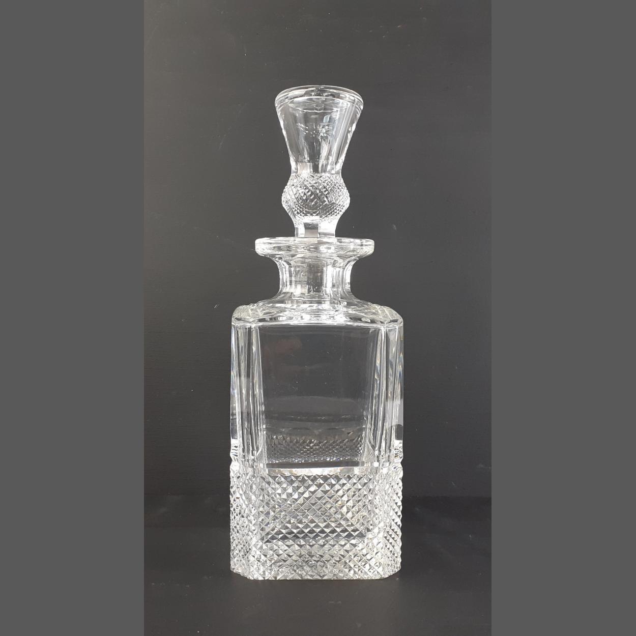 A square crystal decanter with thistle shaped stopper. Stands 28cm approx