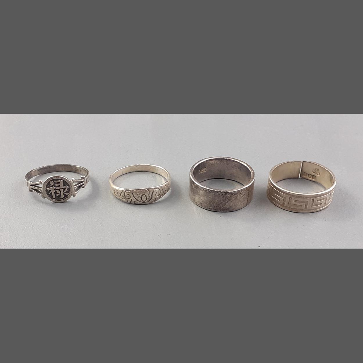 Four silver stamped rings to include three bands and a signet style with Oriental design. Gross weight 13.7g approx