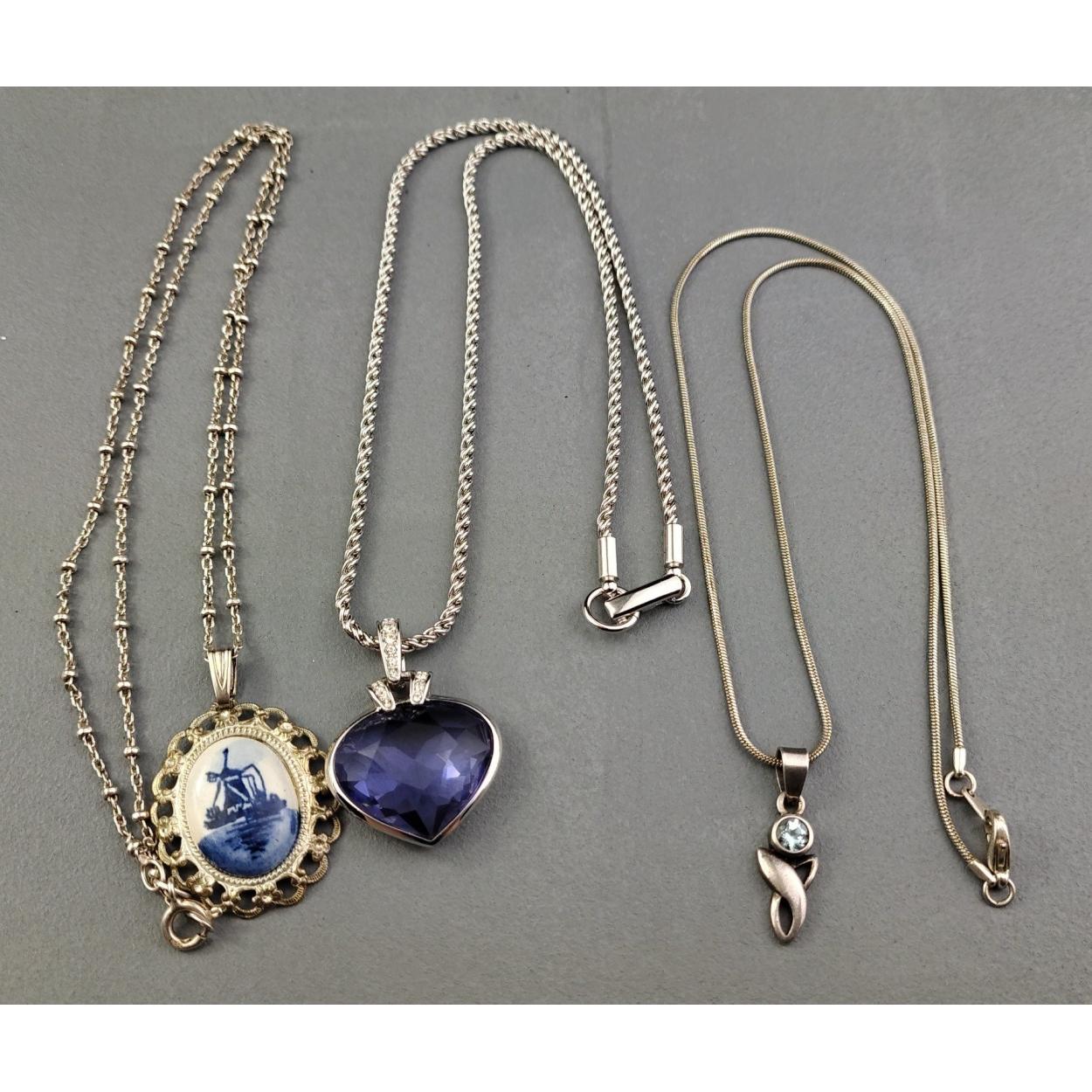 Three silver stamped pendants on chains. One with Dutch style centre and one with large SWAROVSKI purple stone. Gross weight 25.8g approx.