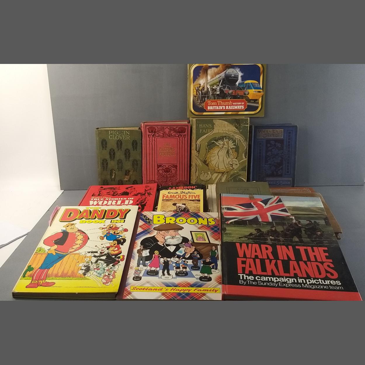 A small collection of books to include THE PILGRIM'S, published James Nisbet & Co (1878?), red cloth binding with gilt lettering, gift inscription in front, no loose pages, firm binding. PIGS IN CLOVER by Frank Danby, green cloth cover, lettered in gilt, and decorated with pigs and clover in black and bronze, published Heinemann 1903 (2nd impression). Cover dirty, fair condition. HANS ANDERSEN'S FAIRY TALES, A&C Black,1912 (reprinted 1917), fair condition, and WARNER'S CHASE by Annie S Swan plus various others including The Broones and The Dandy Annual etc
